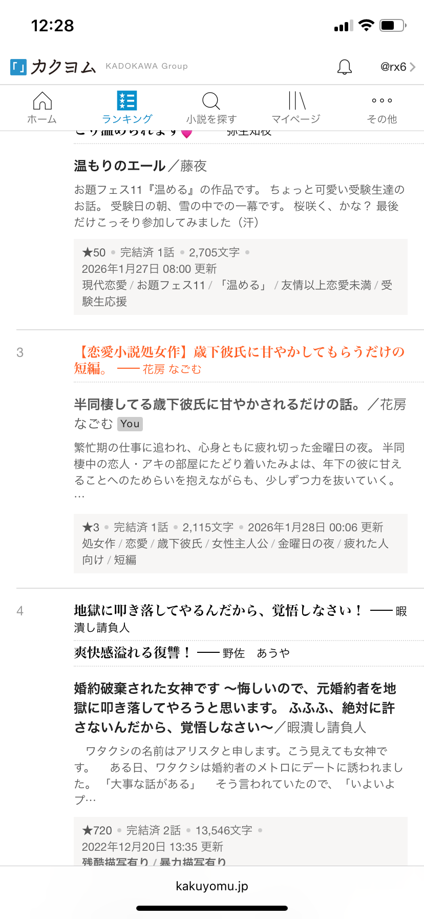 試しに書いてみた恋愛短編がジャンル別日間ランキング3位。ほとんどレビューとからPV数もないのにこれはかなり過疎っている。