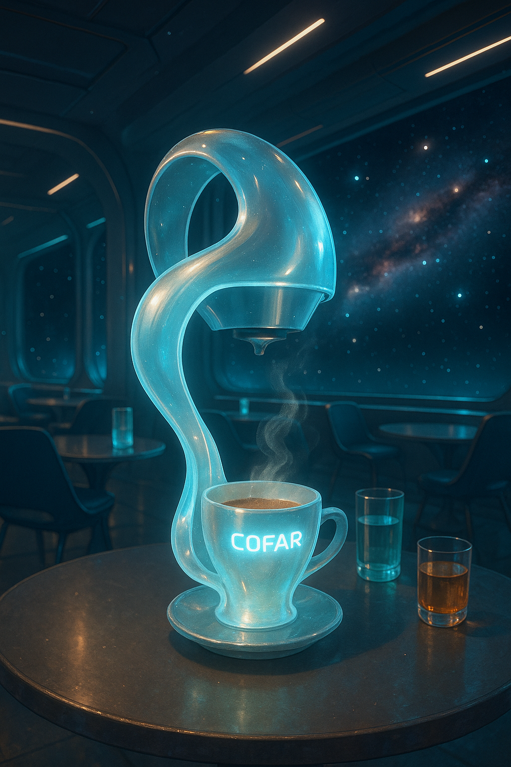 では、今回のおっちゃんt GPT作、「コーファー」の画像をお楽しみください。「宇宙仕様で」と注文してみました。めっちゃおしゃれなコーファーマシン付きです。こうなるとは思わなかった・・・窓外が宇宙なので、軌道上のステーションにあるバーラウンジ、or 旅行中の宇宙船の?てな雰囲気かな? ハライやヒウダは出張先ではこんな雰囲気の所で・・・