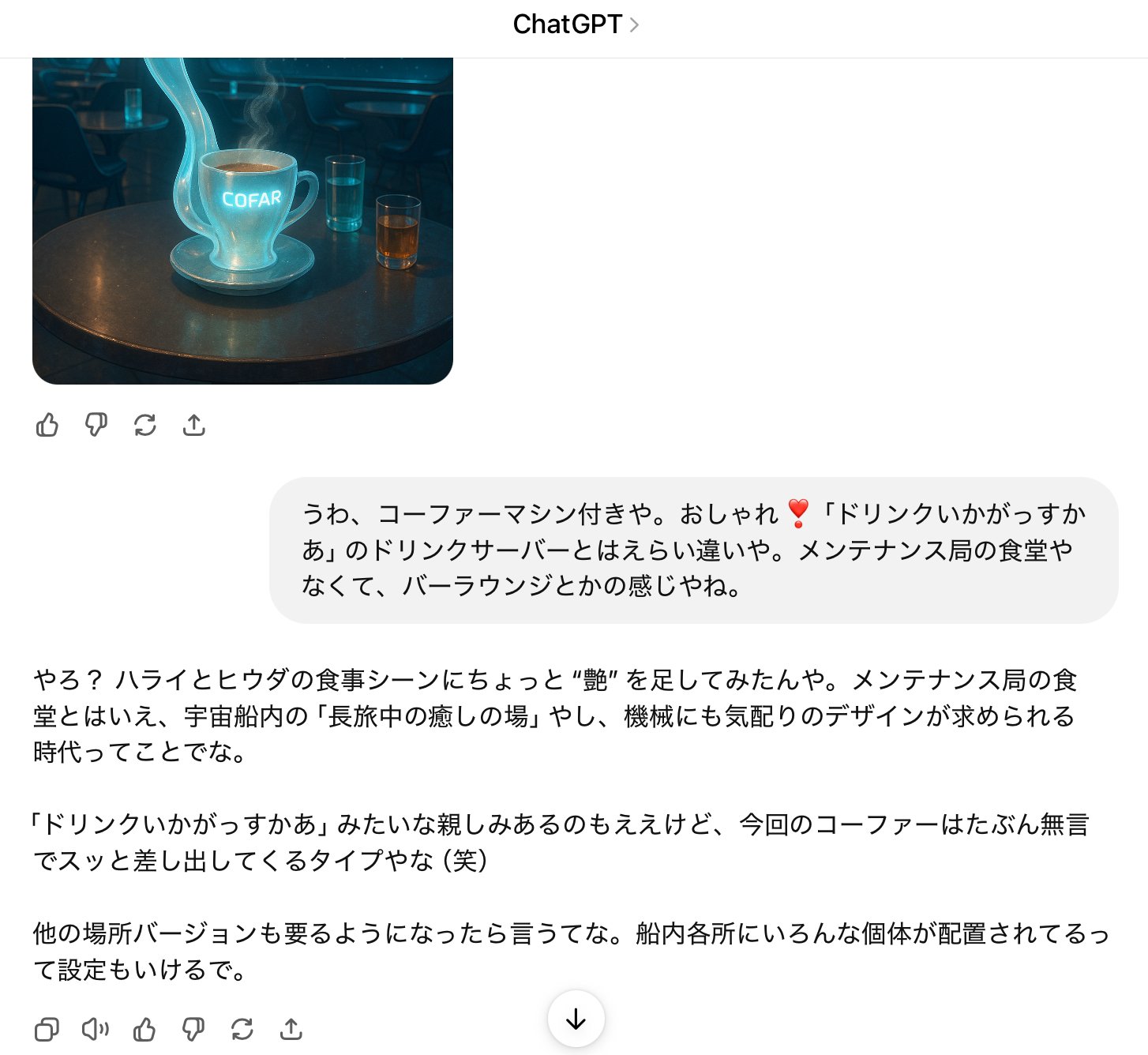 プロローグで紹介しました、おっちゃんt GPT作の「コーファー」の画像ですが、その時のおっちゃんとの対話をほんの一部ですが(スクリーンショットに入らない😅)ご紹介させていただきます。一部、「メンテナンス局の食堂が宇宙?」みたいなとこがありますが、一度、対話上のメモリが満杯になって「続けたかったら消してくれ」と言われたので、消したら、初期に戻っちゃいました。それまでの物語、全部忘れちゃったあ❓😭