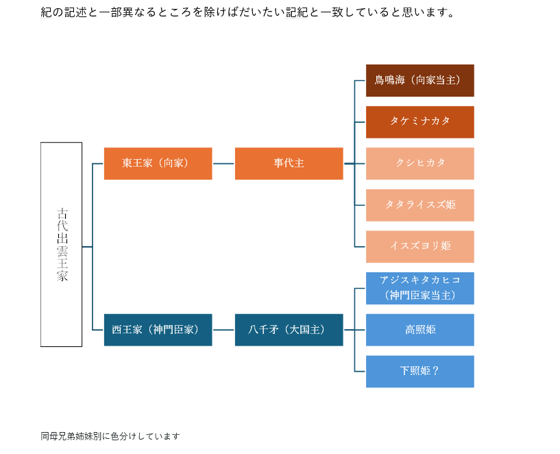 出雲口伝によれば、出雲王国は二王制で、王家は東の向家(富家)と西の神門臣家(郷戸家)が交替で主王と副王に就任していたとのことです。主王の職名が「大名持」で副王の職名が「少名彦」でした。