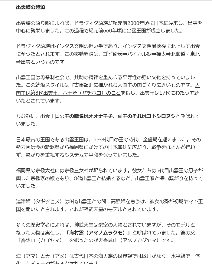 そもそも、出雲自体が起源がインド系の民族移住で(出雲口伝による)、沖縄にはエジプト、シュメールなどから渡来してきた海人族の痕跡が多数あり、太陽をオレンジ色に描く(世界的には黄色が多い)のはエジプトと日本だけだし、つまり、日本はエジプト、シュメール、などの呪術的な女神信仰や製鉄技術、ユダヤ商人の徐福(物部氏)、騎馬民族の突厥の聖徳太子(シリウス信仰、ユダヤ人の秦河勝)、ベースには縄文の女神瀬織津姫信仰などが今の天皇家に入ってる。