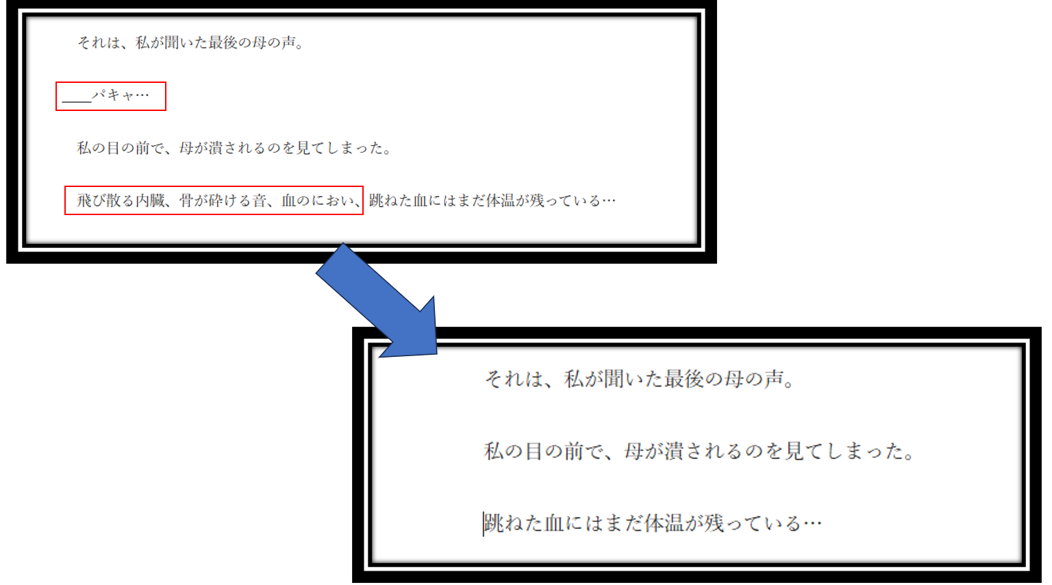 なのでグロテスクなオノマトペ、あまりにもリアルすぎる表現がされている部分は消させていただきました。