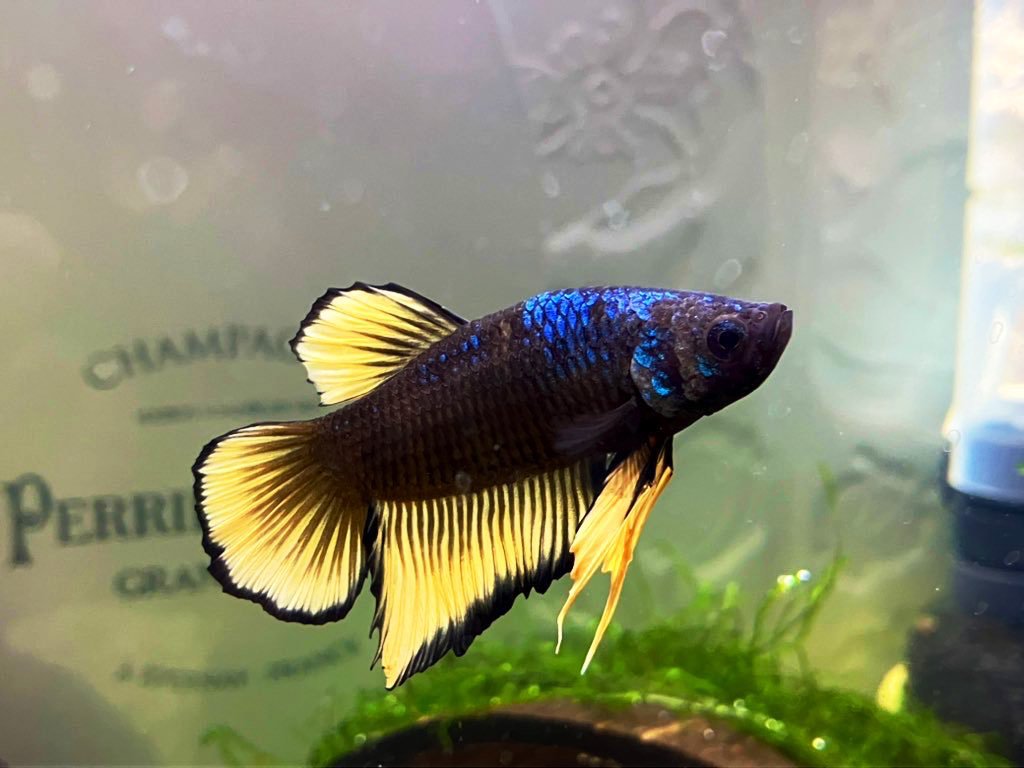 ベタの中でもヒレが短いタイプ、闘魚として使うのに近い種類なので超短気、バックスクリーンに映った自分を見てずっと威嚇してました。とりあえず後ろにその辺にあったシャンパンの箱を置きました。