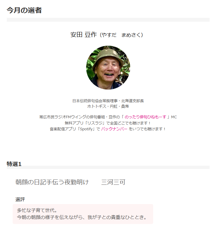 第2回カクヨム短歌・俳句コンテスト以降、色々な投句サイトに挑戦していました。最近は足踏み状態で良い結果が出ていませんでしたが、日本伝統俳句協会Web投句箱で初の「特選句」に選ばれました。そして短くはありますが、選者コメントも!