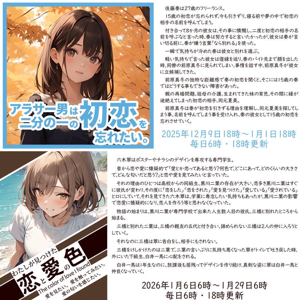 ラブコメは「アラサー男は二分の一の初恋を忘れたい。」で、主人公の後藤奏が15歳の時にした初恋をアラサーになっても引きずっていて、暫定彼女の前原真冬と付き合って、忘れていく話です。