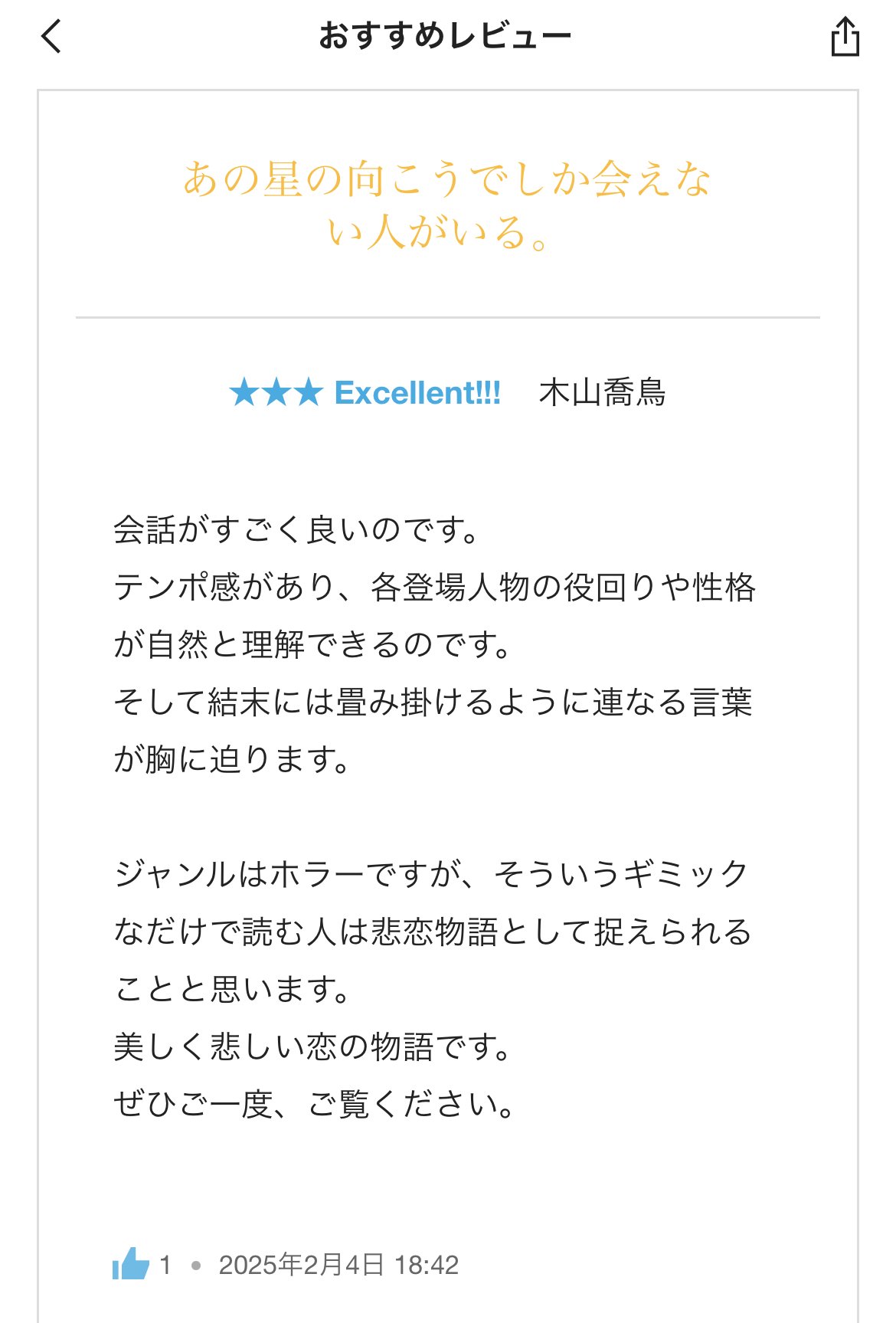すっかり埋もれて読まれなくなった短編だったので、本当に嬉しい。どうやって見つけてくれたのだろう。めちゃくちゃ嬉しいです!!