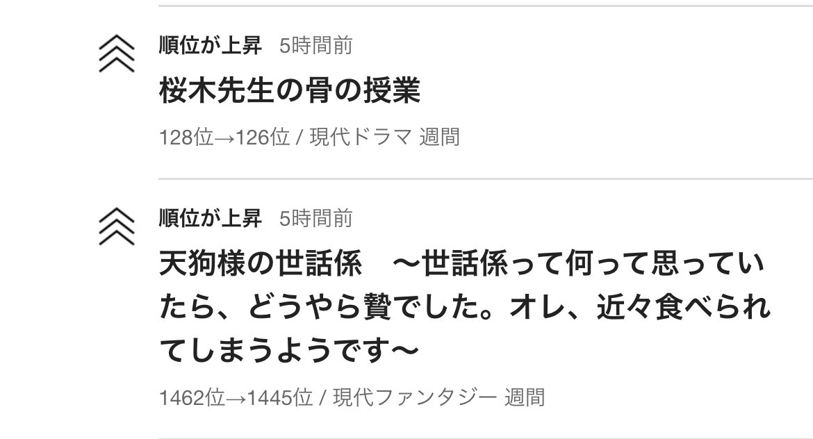 ランクアップした作品は、真夜中に更新した【天狗様の世話係】、そしてお題【骨】でかいた【桜木先生の骨の授業】