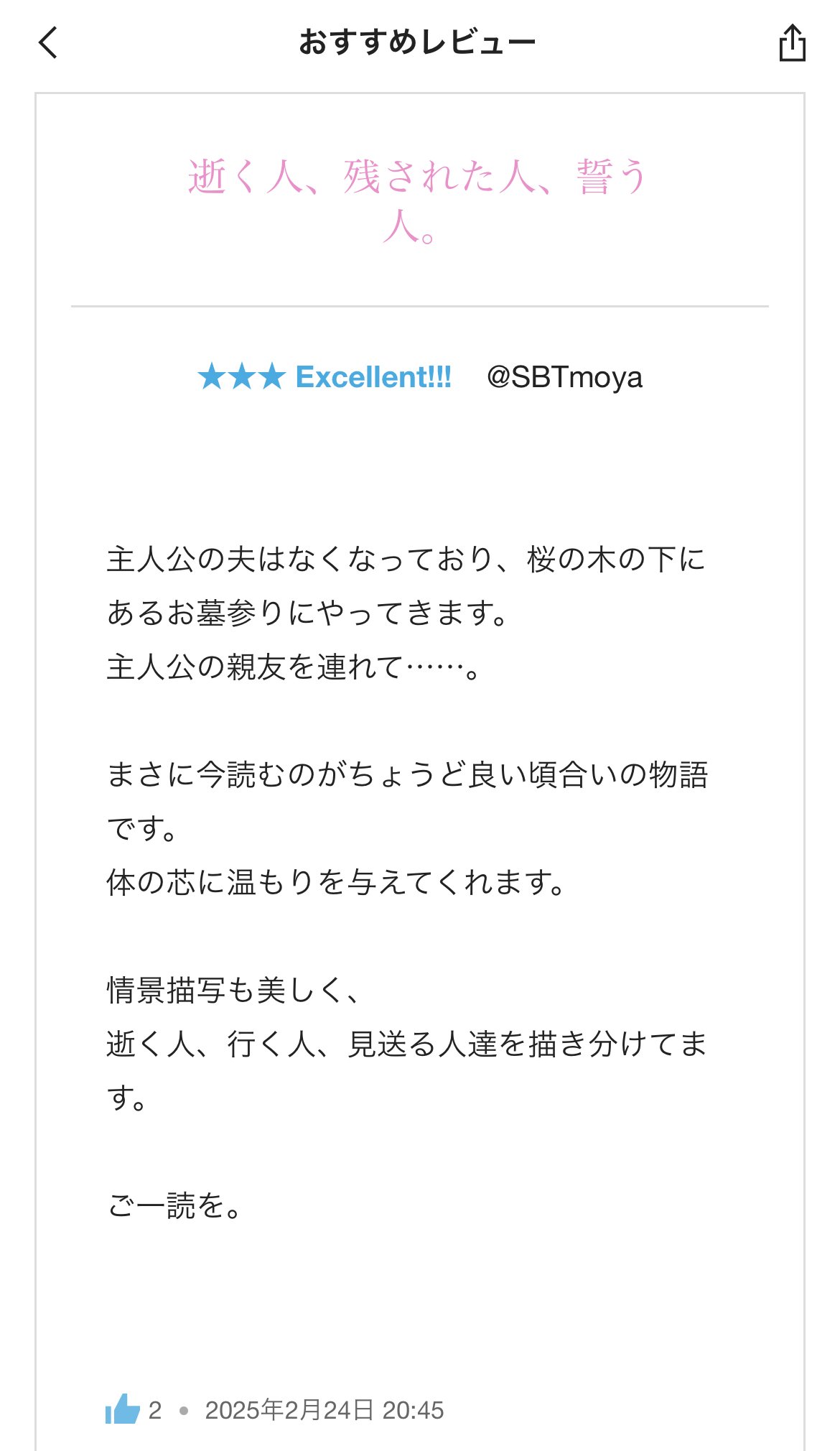 https://kakuyomu.jp/users/SBTmoya【春の陽射し】は、『ちょっと切ない大人の恋愛』を描いた作品です。