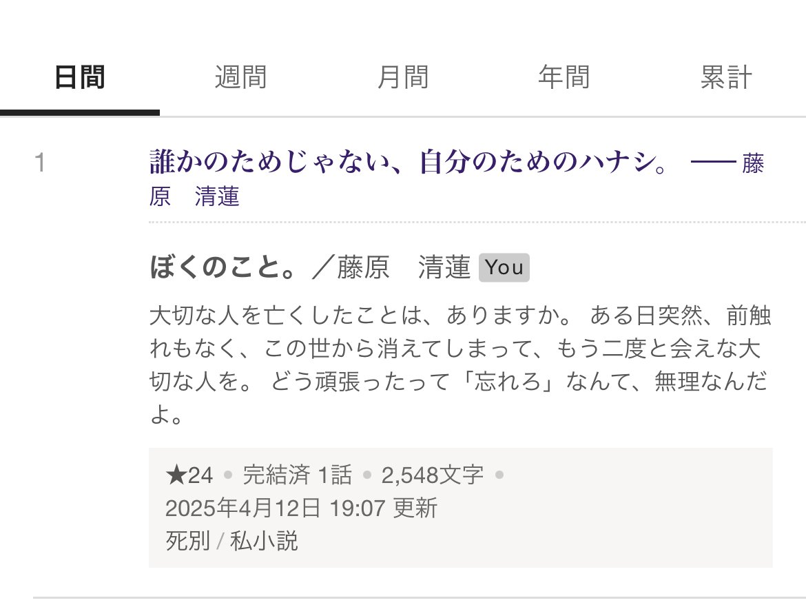 https://kakuyomu.jp/works/16818622172935683622これがね、なんと本日の日間で1位だったんです。まさかの。苦笑