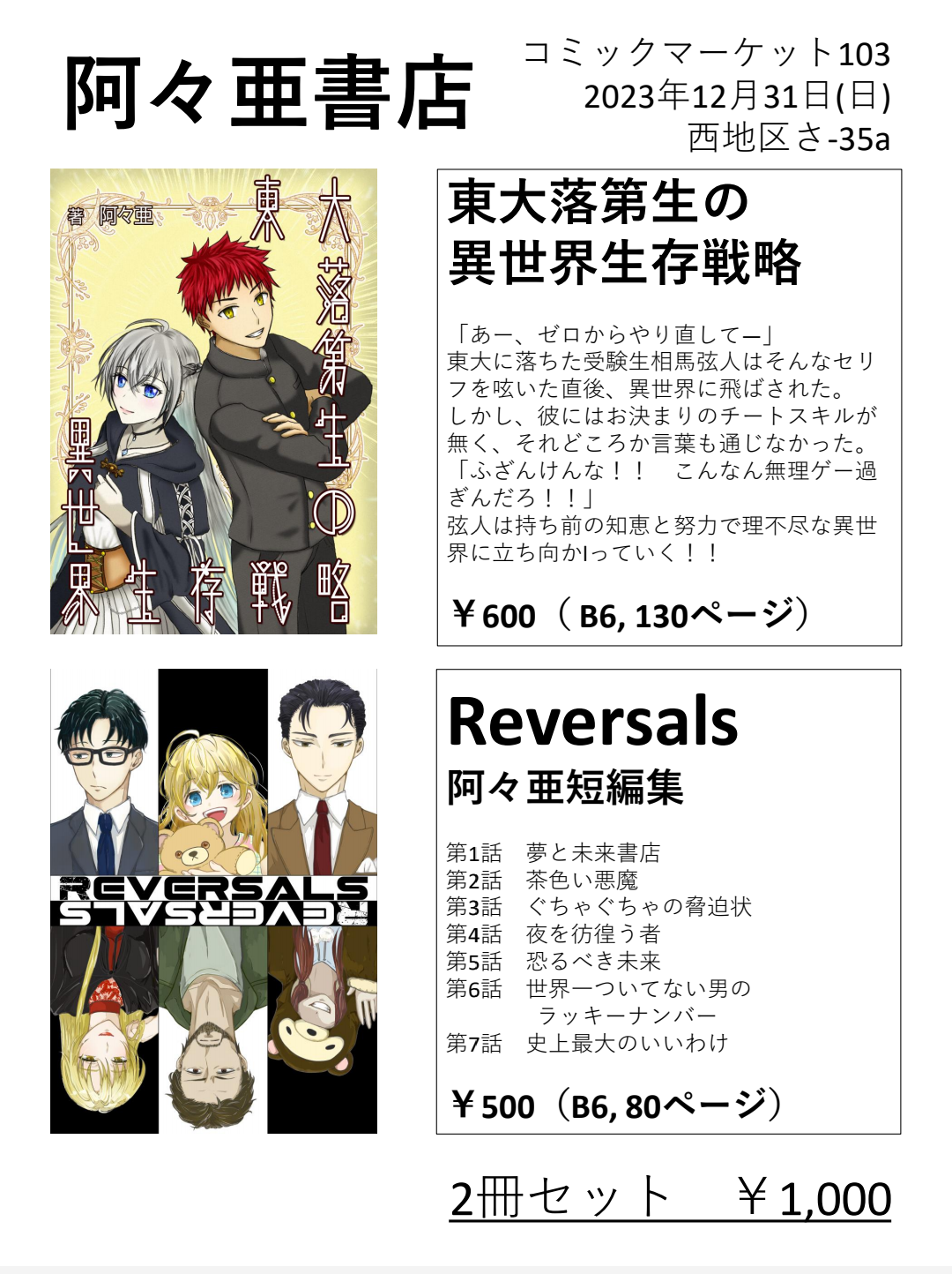 長編「東大落第生の異世界生存戦略」、短編集「Reversals」の2点を頒布します。