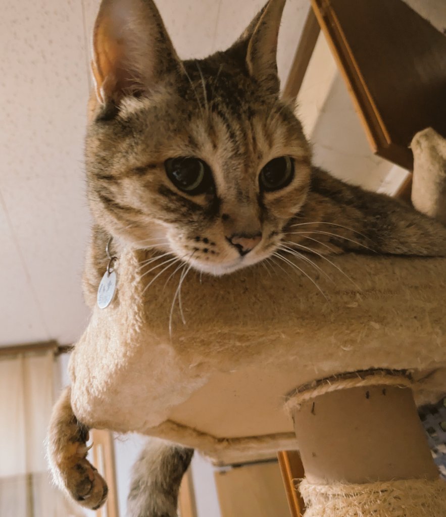 画像は古いキャットタワーでくつろぐ我が家のお嬢です。
