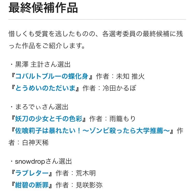 初めて書いた長編小説です。2ヶ月間このことしか考えてなかったです。このことであたまがいっぱいでした。前年大賞を頂いたのですが、今年参加しなかったら逃げだと思ったので参加しました。難しいテーマだったのでどう書くかすごく悩みながら締め切りギリギリまでいじくっていました。エンタメじゃないからそもそもカテエラなんじゃないかとびくびくしていました。面白くはないなと思っていました。ミステリーとしても弱いよなと思っていました。そのくせ変に期待していたのが本当に面白い。何もかもまぐれでここまでなんとしなくやってきたからか何もピンとこないし、そんなものなのかとおもっています。賞って素敵だなって思いました。小説に対する向き合い方を変えないといけない。もっと早くするべきだったのかな。本当は何の意味もなかったっていってほしかったです。諦める理由がほしかった。失望してほしかった。でもそういうわけにはいかないってのが酷ですよね。呪いじゃないですか。そういうものなのか。ごめんなさい。本当にありがとう。