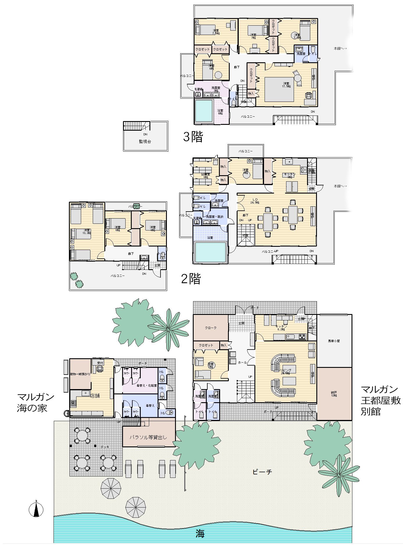 海を南に、西側に〈海の家〉東側にマルガン伯爵の帝都の別館です、さらに東に大きな本館がある設定です~。間取って妄想膨らみますよね♪