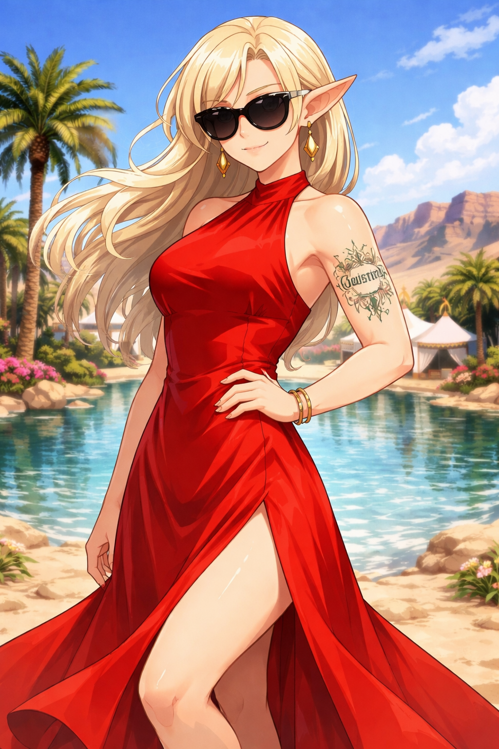 美しくも男前なエルフのお姉さんは、砂漠の中のオアシスでドレスにグラサンが似合います~