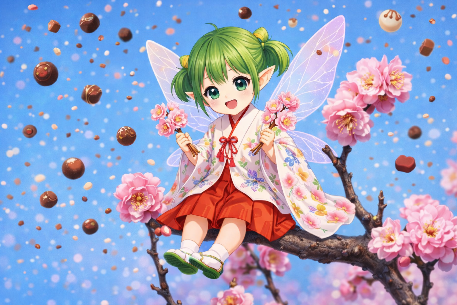 チョコレートがいっぱいの緑色ちゃんのイラストで感謝の気持ちを!