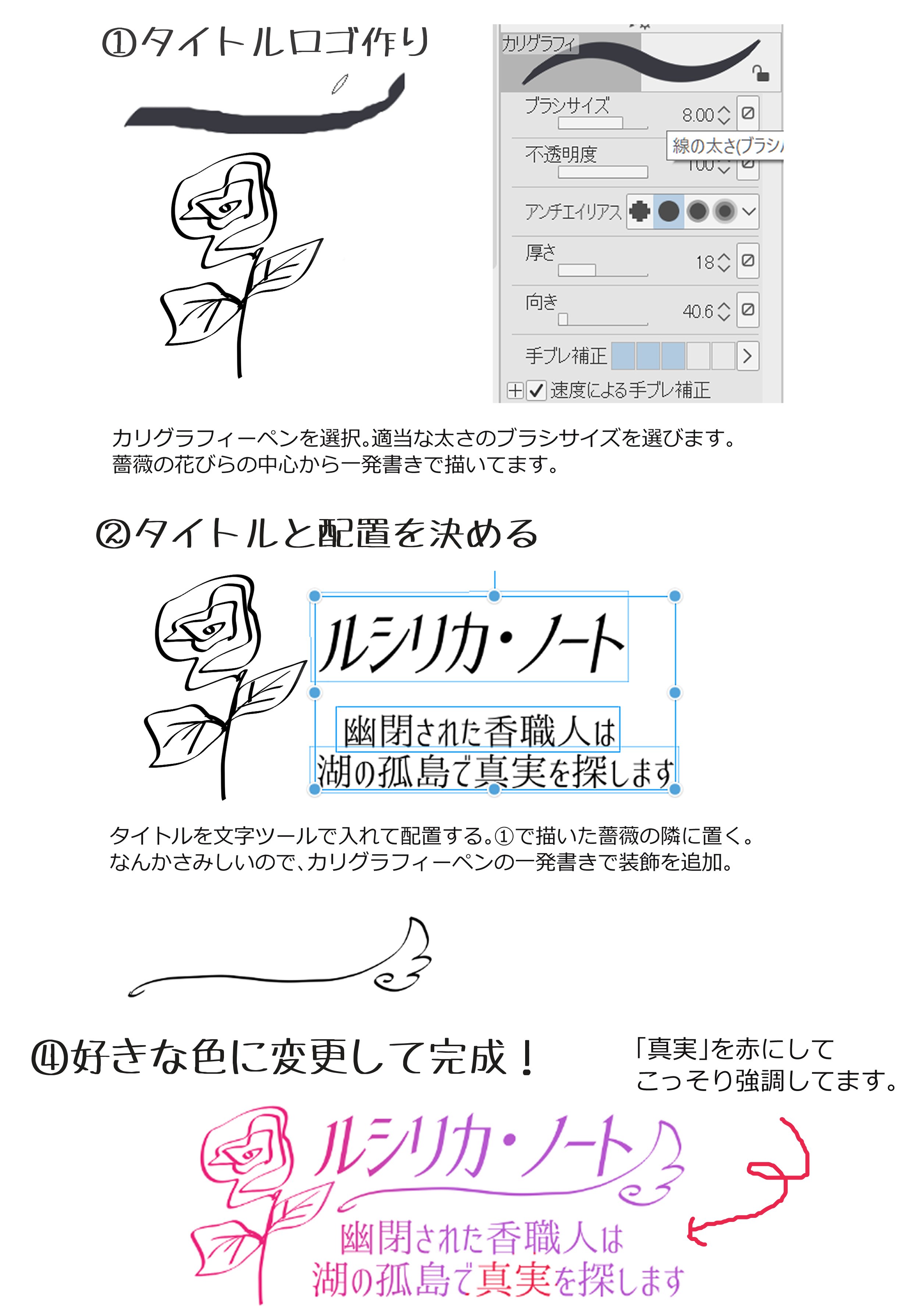 ③①で描いた薔薇の隣にタイトルロゴを並べてバランスをみます。ちょっとさみしいので、「ルシリカ・ノート」の下に、ポヨン鳥の羽を思わせるアンダーラインをカリグラフィーペンで描いて添えました。