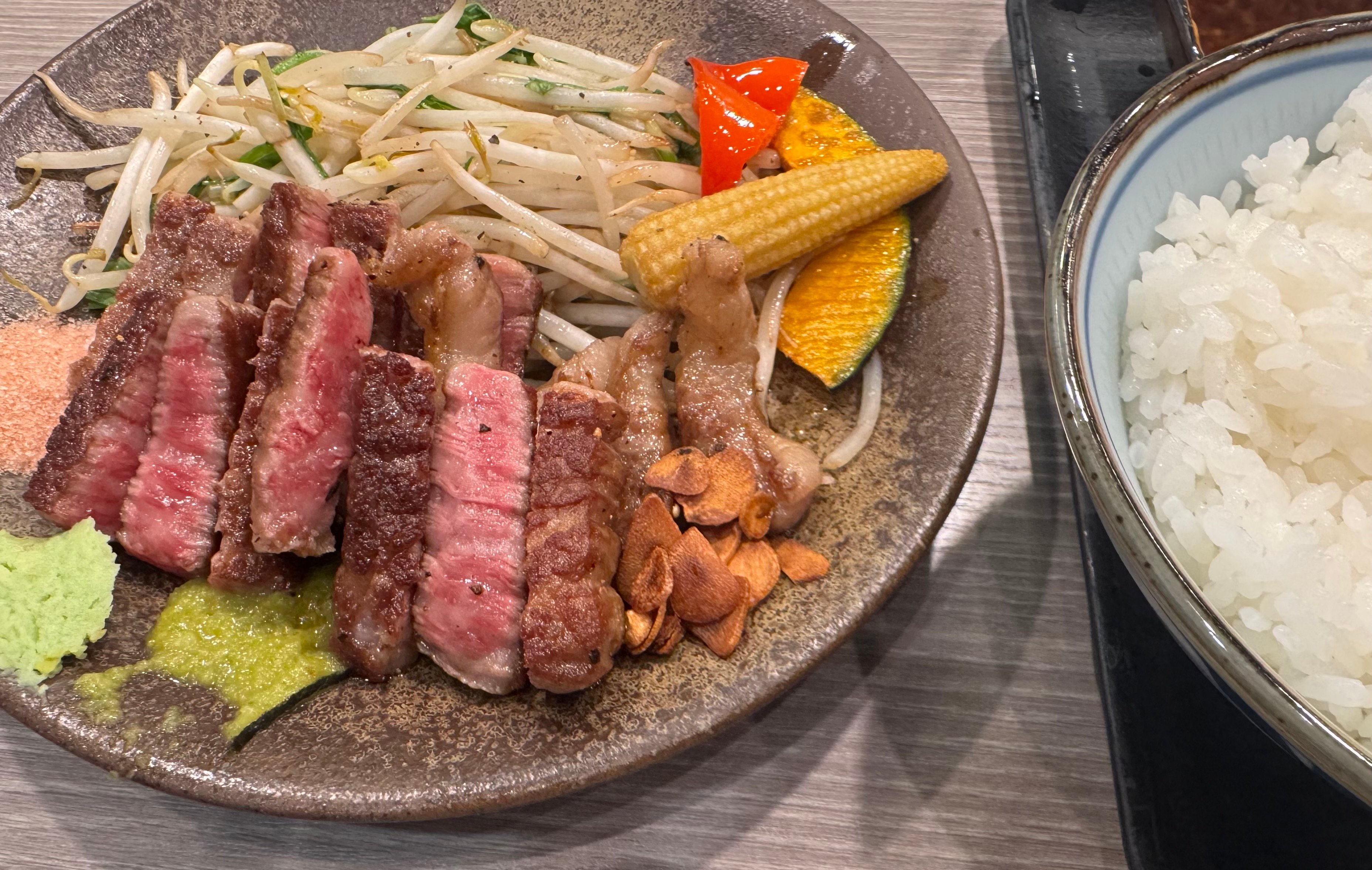 チェックインまで少し時間があるので百番街の肉食堂さんで能登サーロインステーキ150gとご飯セットを頂きました。5150円。前に来たときより高くなってるような気がします。まあ仕方ないですね。
