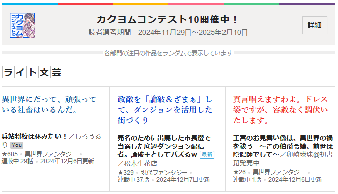 もうご存知の方も多い、というか昨日今日の読者の皆様の導線ってだいたい表紙から直だと思っているのですが、拙作「兵站将校は休みたい!」がカクヨムコン10のライト文芸部門でいいポジションにいるようで、表紙に載る分野別ピックアップ作品の一画を占めております。