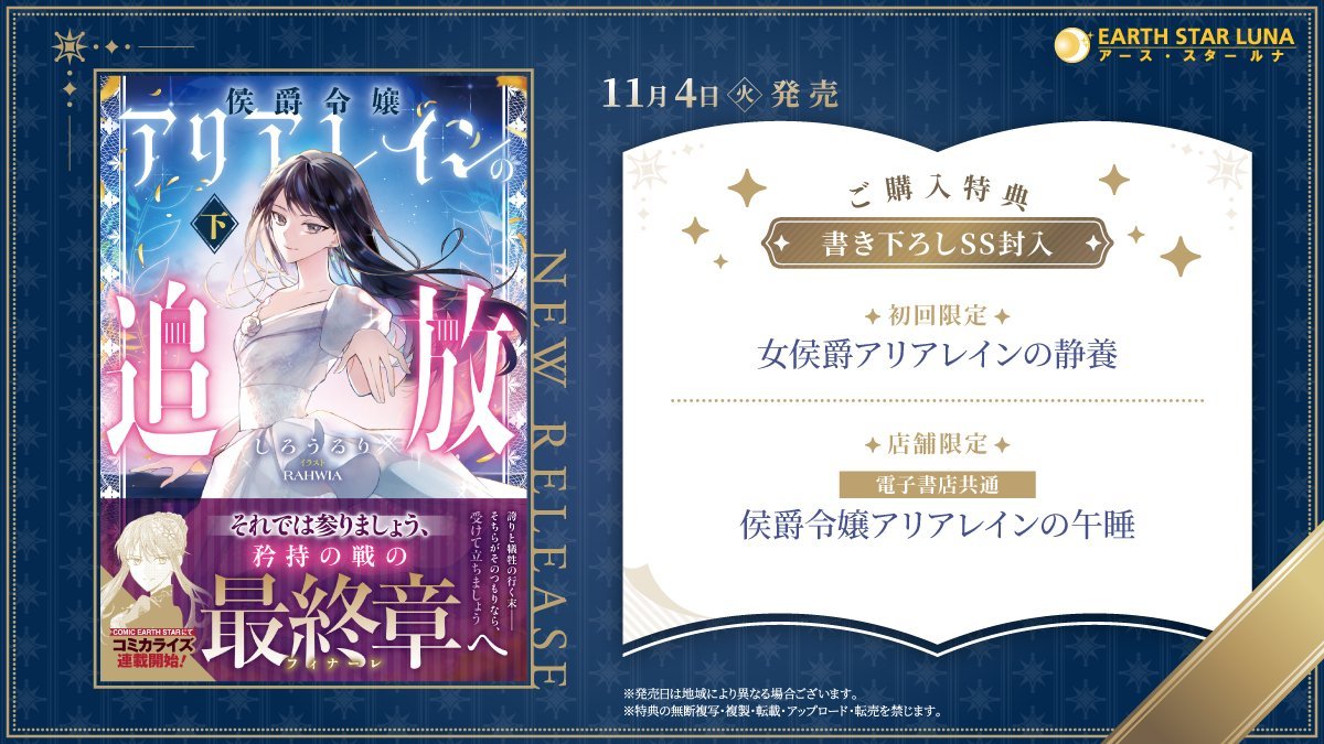 第6回アース・スターノベル大賞にて佳作をいただき、今年3月から刊行しておりましたしろうるりのデビュー作「侯爵令嬢アリアレインの追放」下巻が11月4日に刊行されます。
