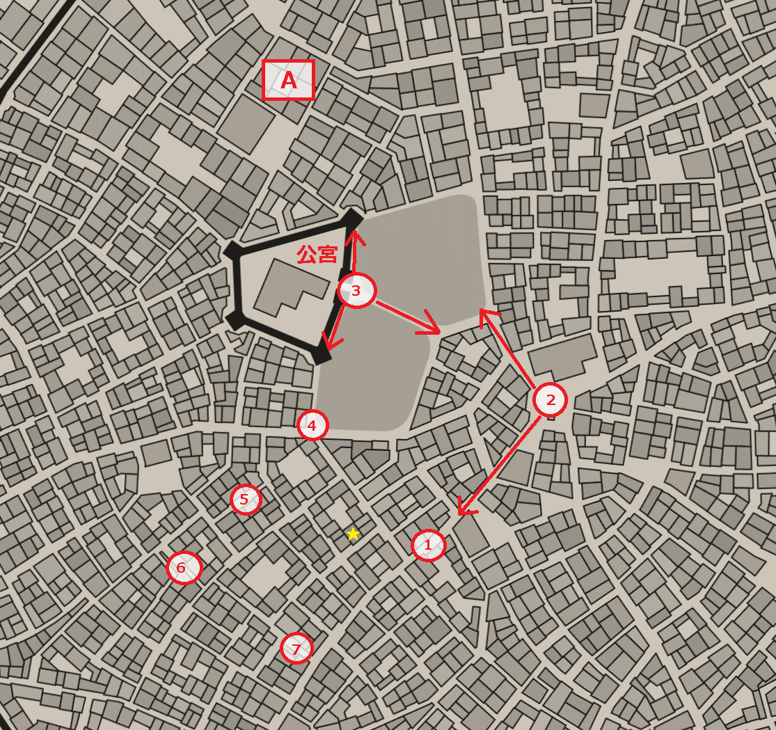 事件当時の状況に、公宮入口の守衛からの視界を追記したものです。