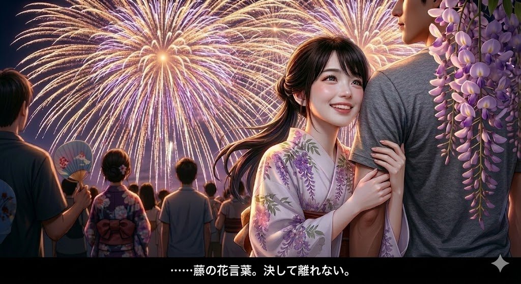 最後に、さっき、ジェミニ先生に頼んで、「藤棚の灯」のエピローグのアートを作って貰いました。そうです! 18歳になった灯(改め桃ちゃん)と拓兄が長岡の花火大会を見に行っているアートですね。長岡の花火大会、本当にこんな感じで、視界を覆い尽くすんです。もちろん強引に垂れ下がっている藤の花は撮影者が持ってきたイミテーションですw 桃ちゃん、花火ほったらかして藤の花見てるし。。あと拓兄は笑顔一つなく、マネキンのようでございますなあ。。まあ彼は添え物みたいなもんだからいいでしょう。