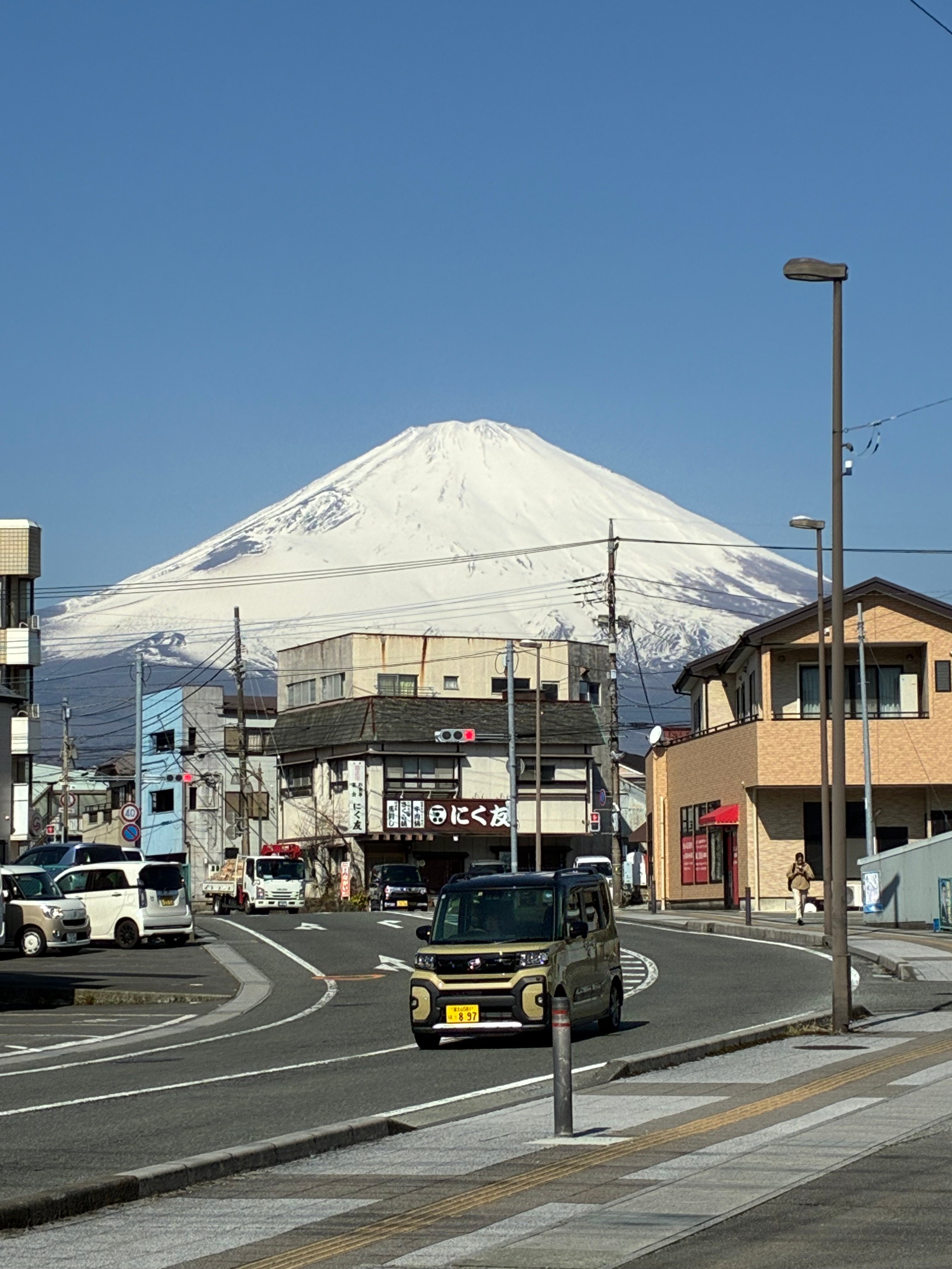 写真は、こないだのお彼岸に母の納骨に行ったとき、朝、ホテルの前から見えた富士山です。いろいろ車だの建物だの写っていますが、これがまた「御殿場市の普段の情景」と言った感じで味わい深いじゃありませんか。御殿場の人は、毎日こんな富士山見て生活しているんですね。わたくしみたいに、「わー、富士山だ、富士山だ! デケーなー!」って思わないんでしょうね。