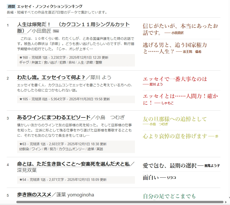https://kakuyomu.jp/works/822139840460079681 が、本当に沢山の読者の方に読んで頂けまして、なんと、エッセイ・ノンフィクション部門総合で、日間及び週間ともに第1位を獲得致しました!