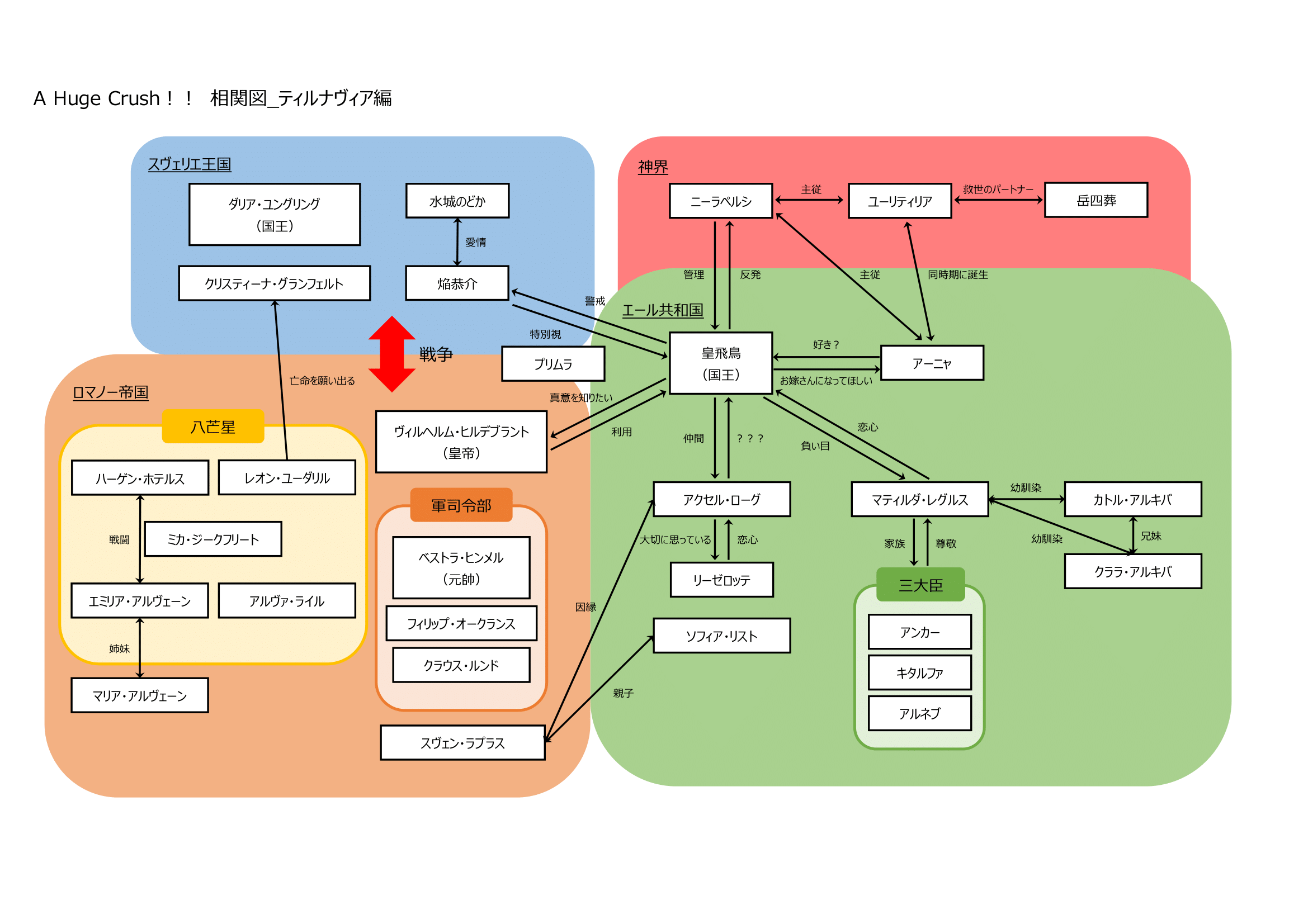 今更ですが近況ノートに画像投稿もできるようになったので、自分用のメモ+興味がある方向けに最新話(第百二十二話)時点での相関図を作ってみました。