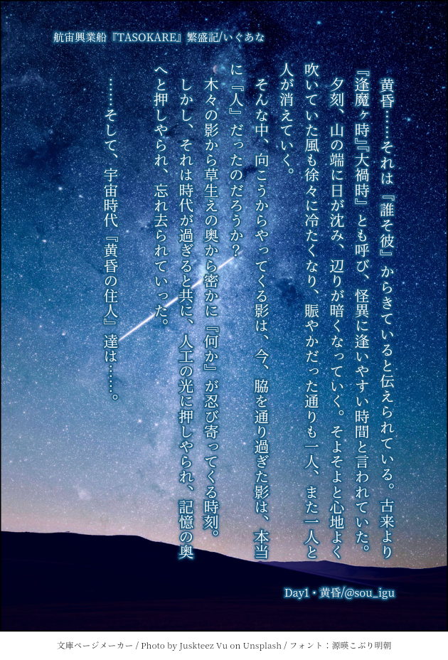 昼から夜に移り変わる逢魔が時。別名、大禍時に潜む妖達は文明が発展するにつれ、人工の光に追いやられ、忘れ去られていった。そして、宇宙時代、人の記憶や語り等というあやふやなモノに己の存在を委ねることを止めた妖達は『黄昏の住人』と名乗り、船に乗り旅をしていた。