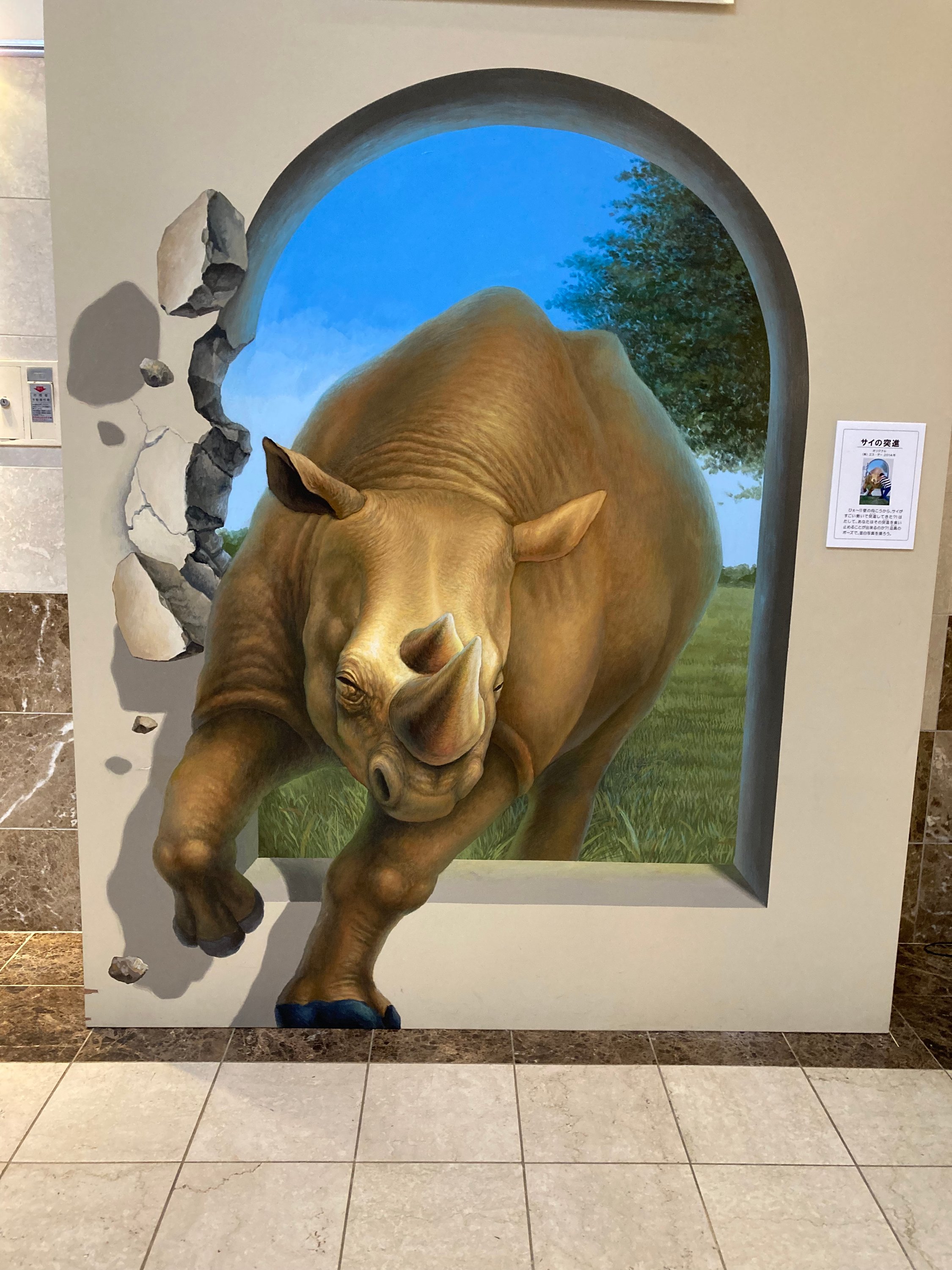今日は友人と隣町のホテルのカフェに行きました。そこのロビーの壁にトリックアートがあるのですが、コレが見事なクオリティーです。