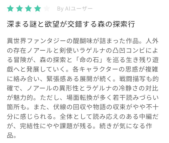 拙作『盾の乙女、異形と共に冒険譚になる』を、別名でcaitaに転載してますが、caitaでは投稿する度にAIによるレビューが更新されます。