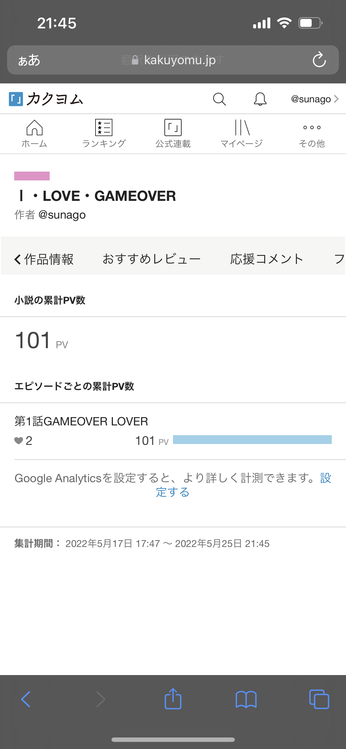 ログインしてない方のスマホで文字稿しまくったらPV数がガッシャガッシャ回ってしまった最高に恥ずかしいアホことsunagoです。個人サイトのノリで、仮にセルフカウンター回しても一日一回でリセットかかるだろ〜〜〜とか思ってたらそういう仕様ではなかったらしく。