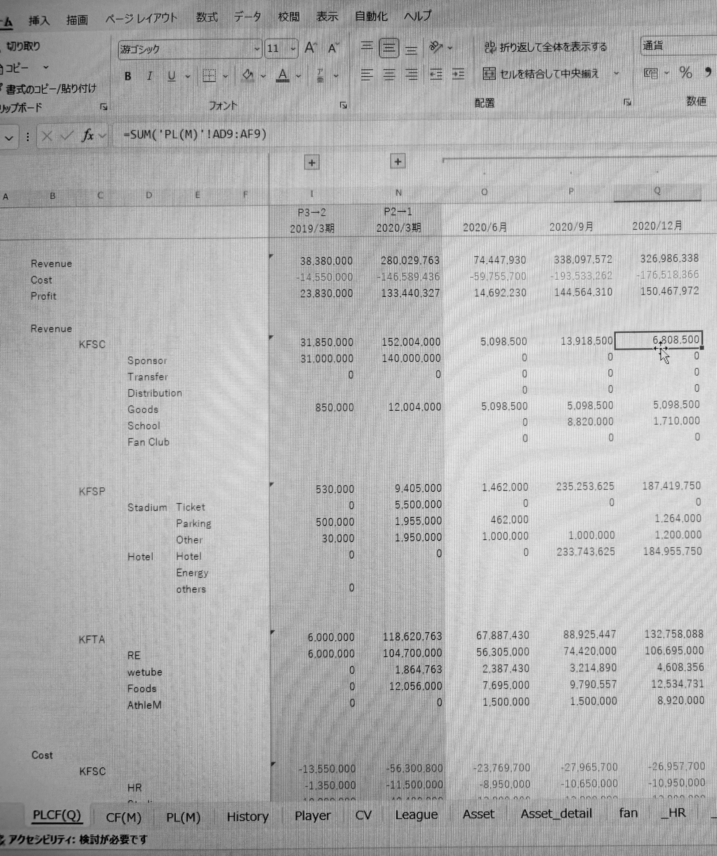 画像は、各事業ごとの損益計算書をまとめた連結のPLとCFで、各数値は、下にずらーっと並んでいる各シートから飛ばしてきております。容量も3メガ超えて重くなってきました。