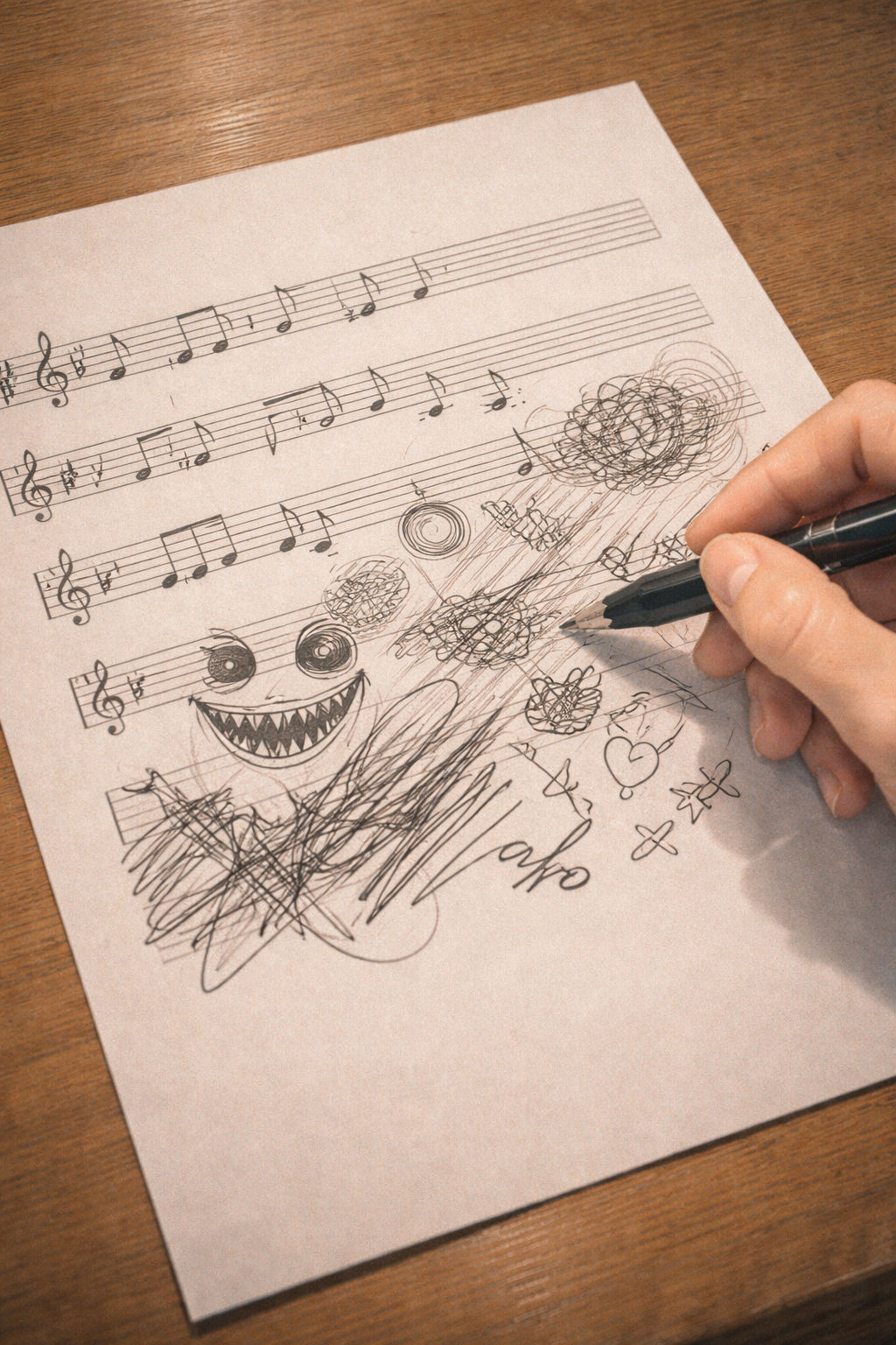 画像は全く関係ない、タクトが五線譜にぐるぐる書いた変な落書きです。