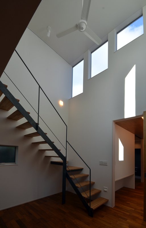 街のど真ん中で日当たりが悪いので、階段一体で吹き抜けを設けて上から採光を取っています。暖かい空気が上に抜けてしまうので、ファンで空気を循環させています。