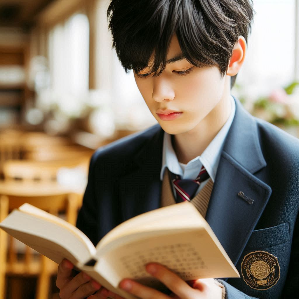 ①日本人 高校生 男の子 黒髪 短髪 学生服 本を読んでいる