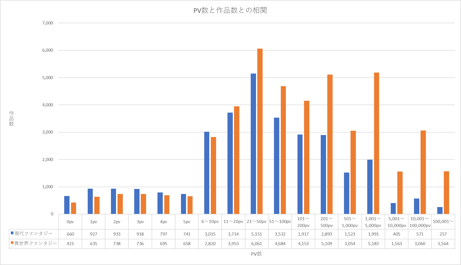 異世界ファンタジージャンルの約半数、現代ファンタジージャンルに至っては約2/3は、PV100の壁を越える事が出来ていないという結果に。