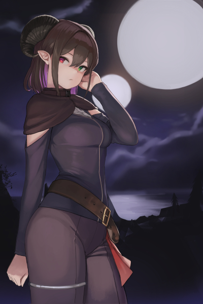赤と緑は、いわゆる反対色にあたる関係にありまして、私としては、彼女をオッドアイにする事で、彼女の持つ二面性を表現しようとした次第で御座います。