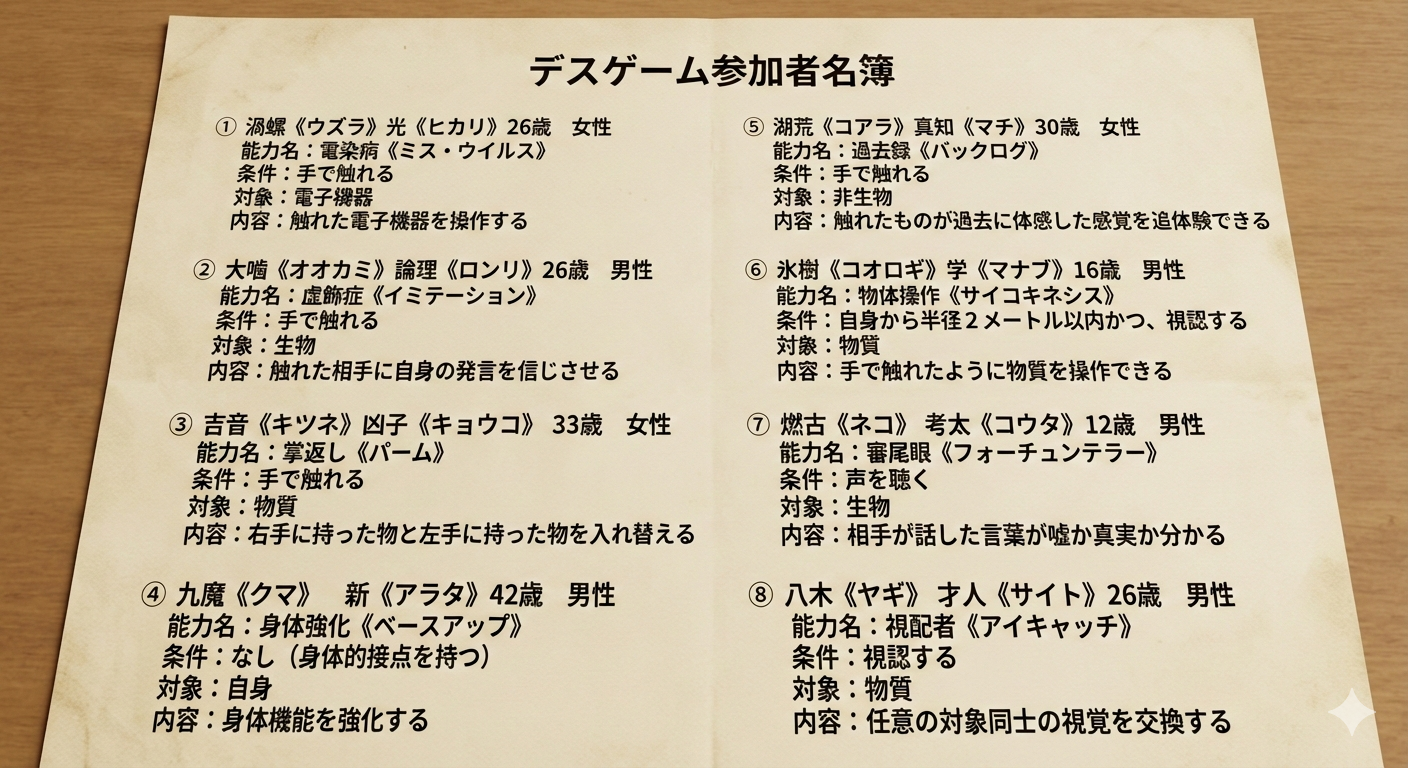 現在連載中の『オオカミロジック』の参加者名簿となります。
