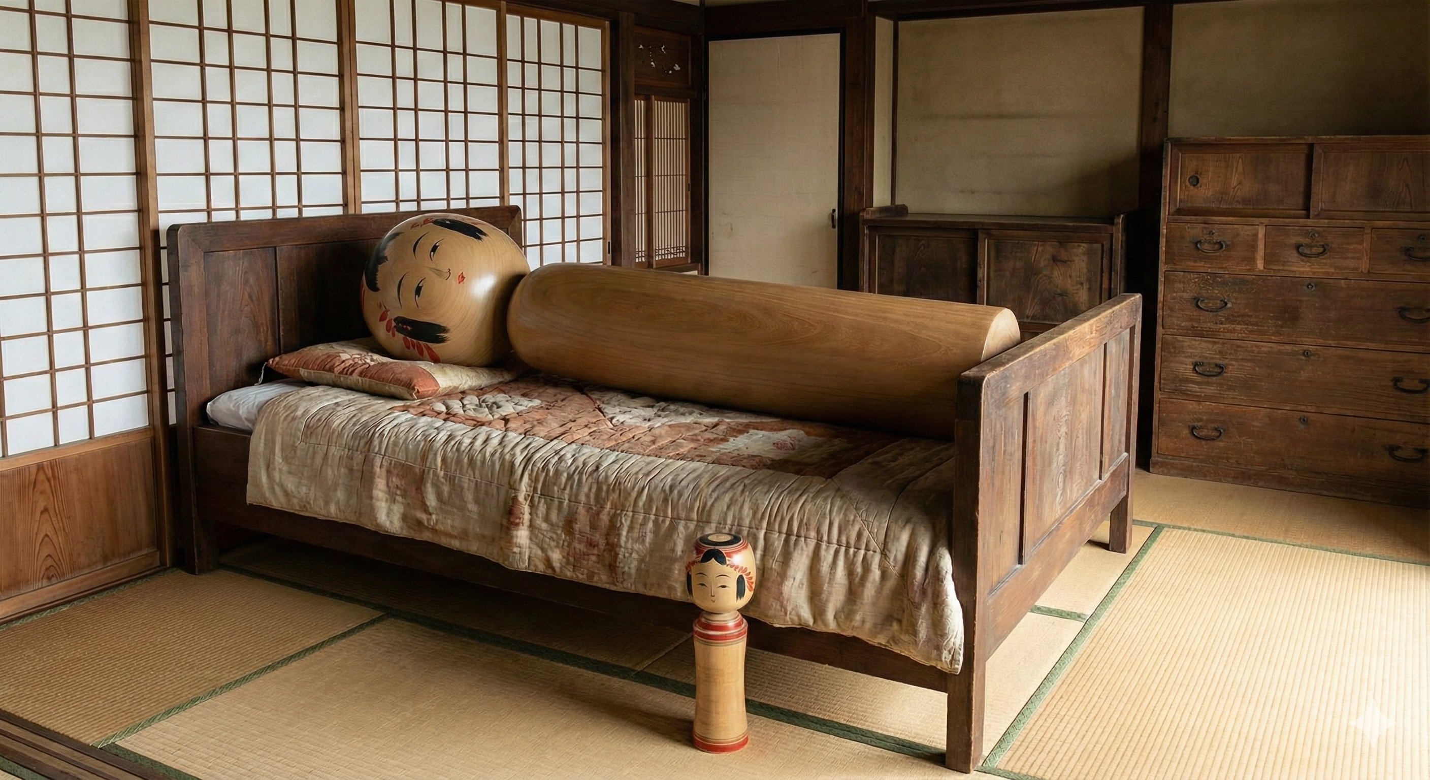 完全に伝統的な「こけし」そのものです。高さは約150cm前後。手足は一切存在せず、滑らかに磨き上げられた円筒形の胴体に、少女の顔が描かれた球体の頭部が乗っています。一見すると工芸品の巨大な木像にしか見えません。しかし、その表面は木目の美しさを保ちつつも、触れれば驚くほど柔らかく、人肌よりも少し高い体温を常に帯びています。