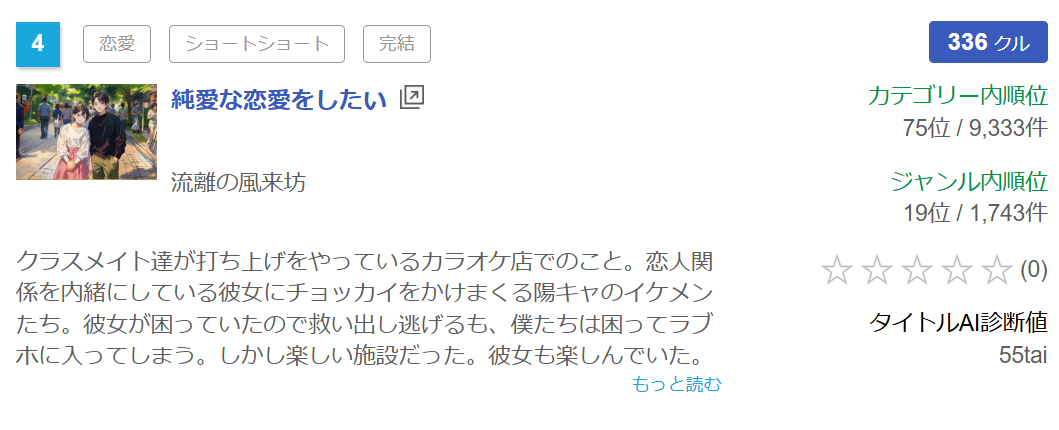 ツギクルに10作品ほど掲載し、効果を見ていたのですが、ツギクルから飛んでくるアクセス増が認識できないほどでしたので、徐々に削除して今は一件しか残していません。昨日登録した恋愛ラブラブ小説です。(画像参照)