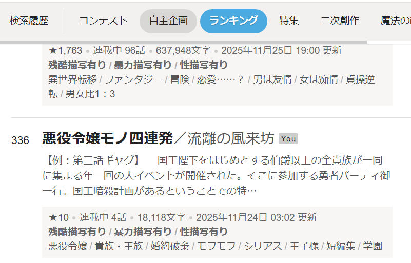 前回、公開した悪役令嬢シリーズなのですが、なろうでは一作を除いて三作がランクイン。(入らなかったのは”作者何してんの?”という、にゃんこモフモフ。なぜこれだけが……解せぬ!)