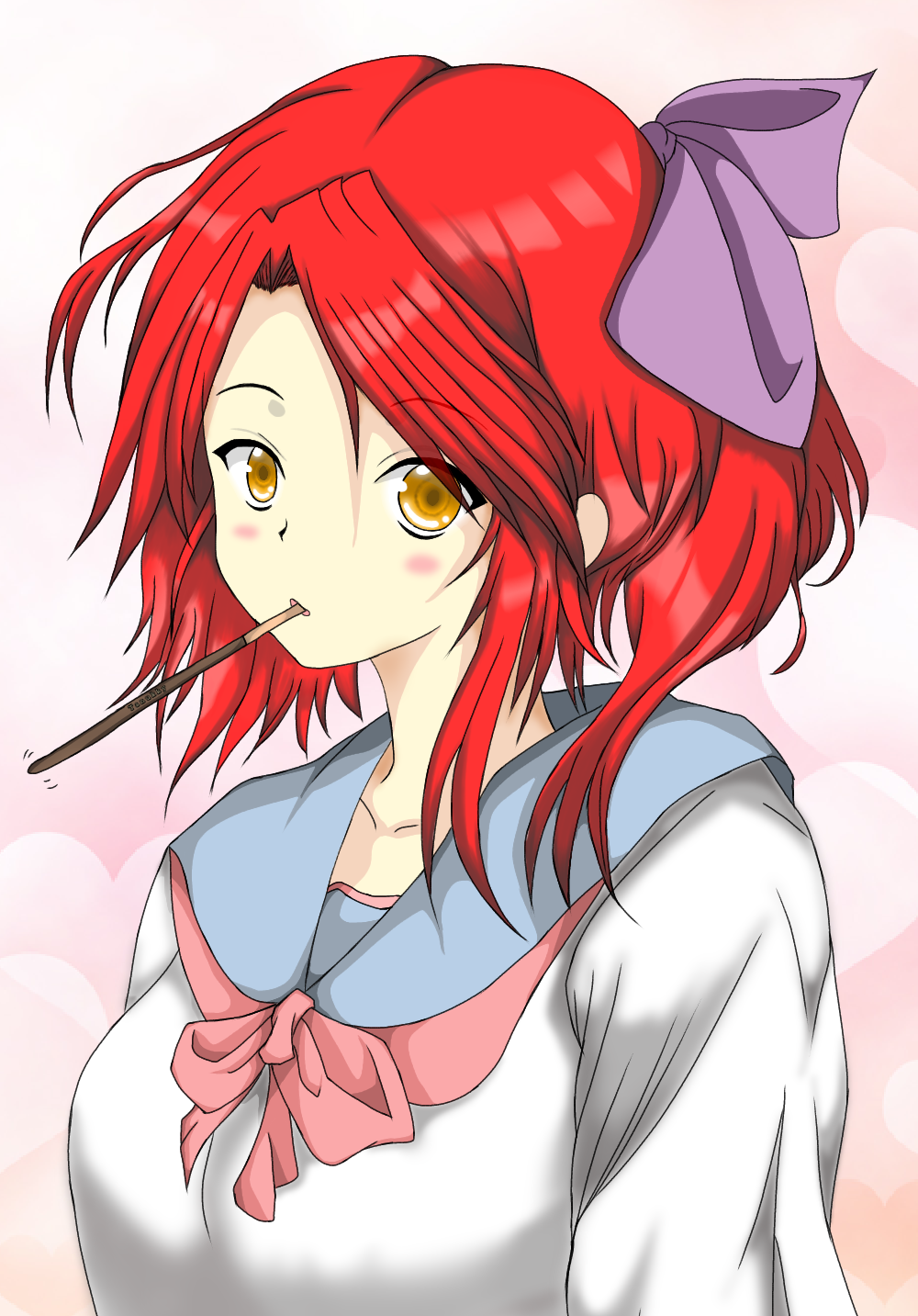 なんで紫のリボンにしたのか赤色の髪にしたのかは、ちょ~っと覚えてないんですけども、なんか万之葉 文郁さんの作品を読んでだ時に、きゅぴーんきゅるるるる☆ってなんか来たんでしょうね、多分(?