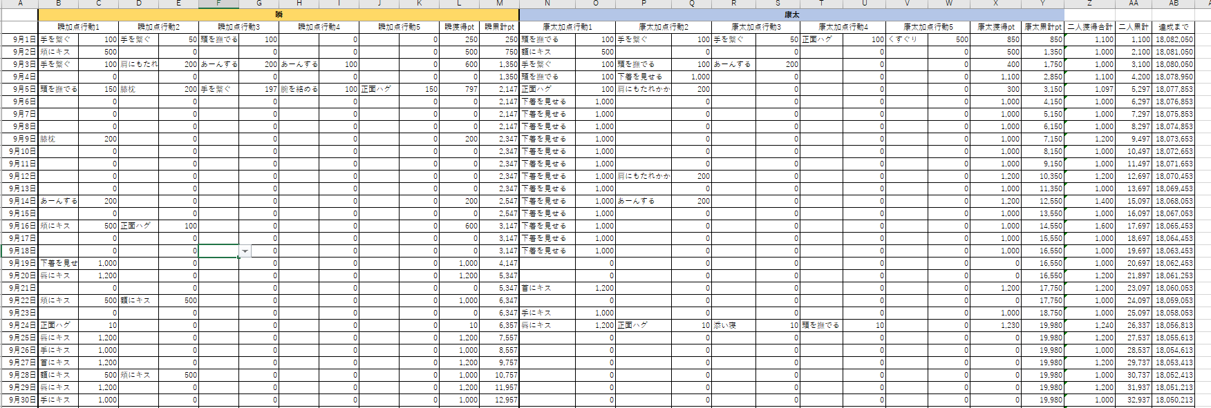 何故発覚したかというと、瞬と康太のポイントの推移を記録するエクセル(画像参照)を作ったら、全然違うやんけ!って感じです。一体どこをどう計算してたんでしょう……