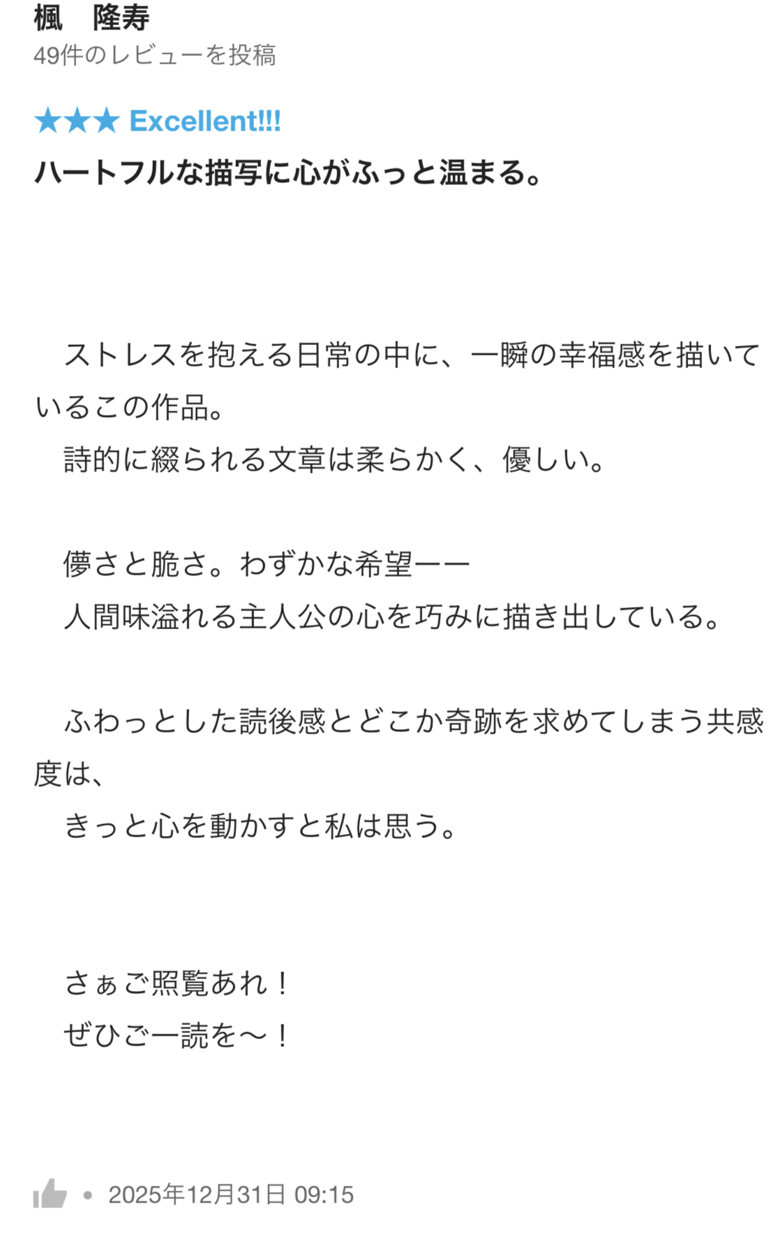 せっかくなので、楓隆寿(カエデ・ルージュ)様の読んで心に残った