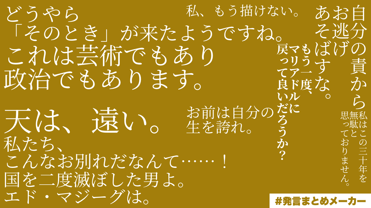 ※画像は今書いてる部分で出てくる第三部の主要セリフをまとめたものですが、まあ……なんというか、最終部も不穏なのが、おわかりでしょうか……。