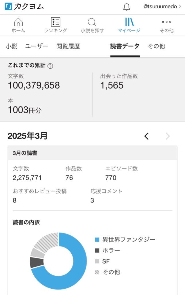 カクヨムの登録が2022/6の末頃でしたので(多分Xの読みます企画のために登録した)、おおよそ2年半で1億文字読んだことになりますね。