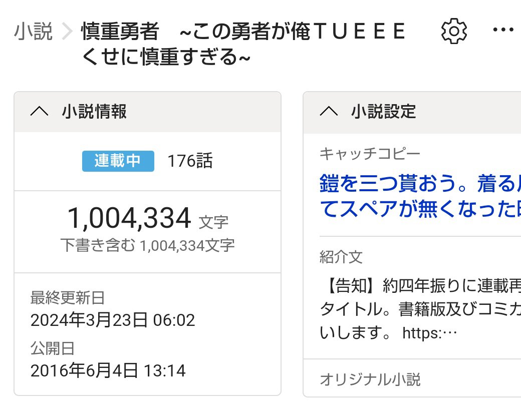 今回の慎重勇者の更新で100万字いきました。掛かった年数かんがえると全然すごくない気もしますが自分的には感慨深いです。これからもよろしくお願いします。