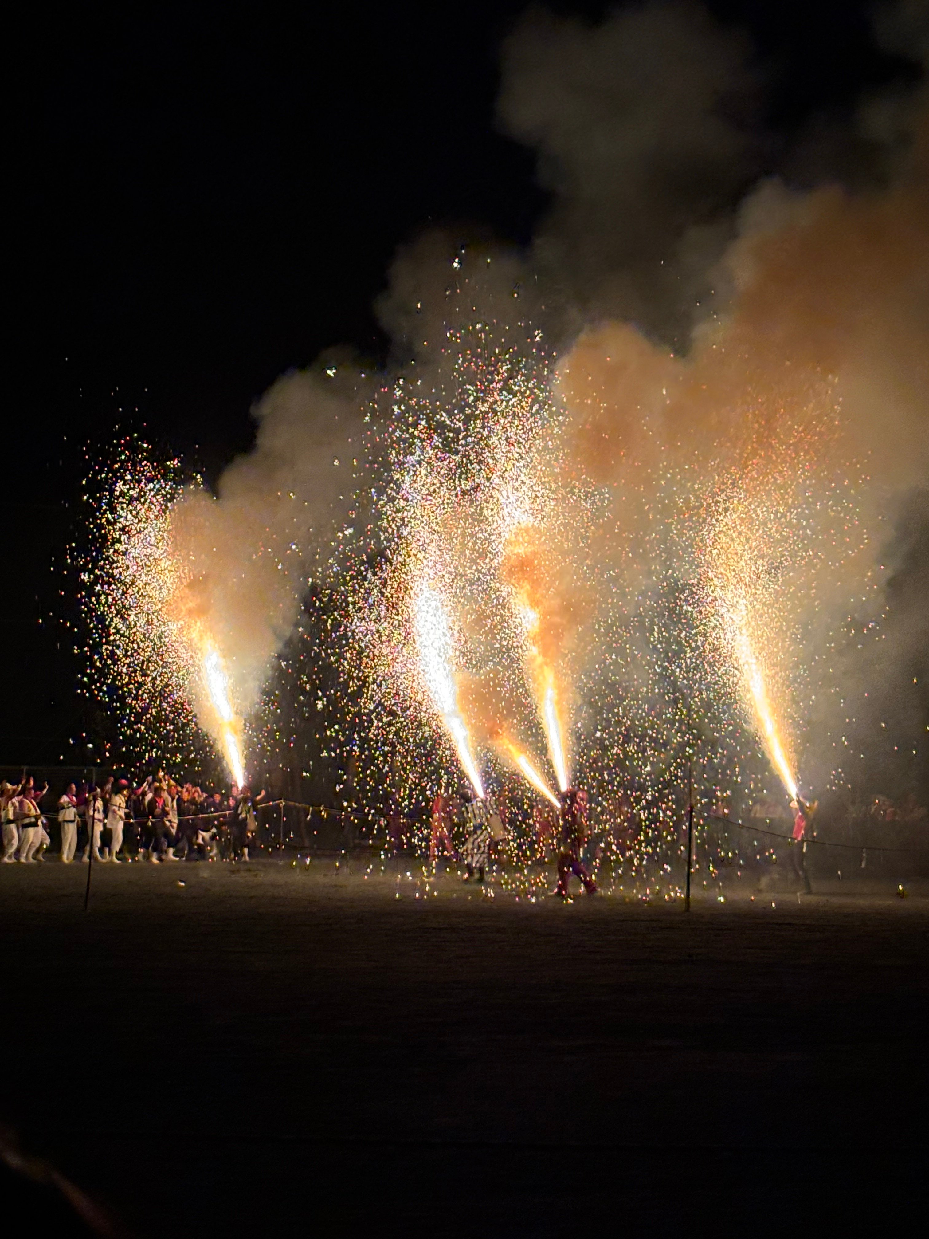 舞い落ちる火花の下、緋色の衣を着た男たちが舞い踊る。