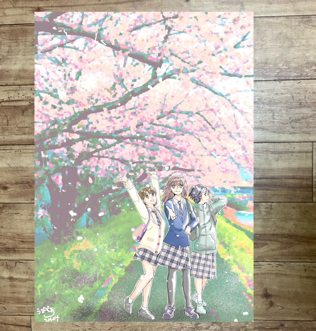 今回は、桜並木の写真が撮れたので、それを利用した絵を描きました。ただでさえ全身図って時間が掛かるのに、3人並べたら、半日くらい時間を持ってかれました。そして、時間が掛かった割には、さして面白くない絵に…。